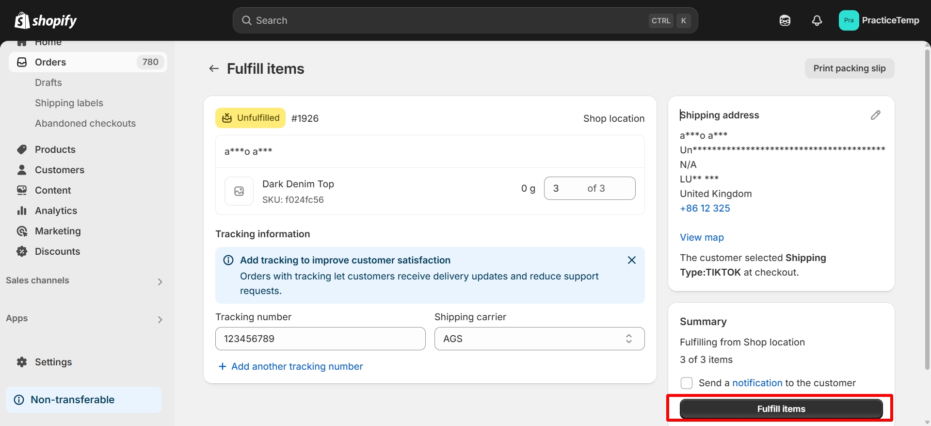 Une fois la commande exécutée dans Shopify, elle sera également marquée comme exécutée dans TikTok Shop.